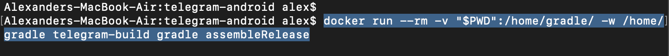 Open Terminal, run the commands:cd $HOME/telegram-androiddocker build -t telegram-build .